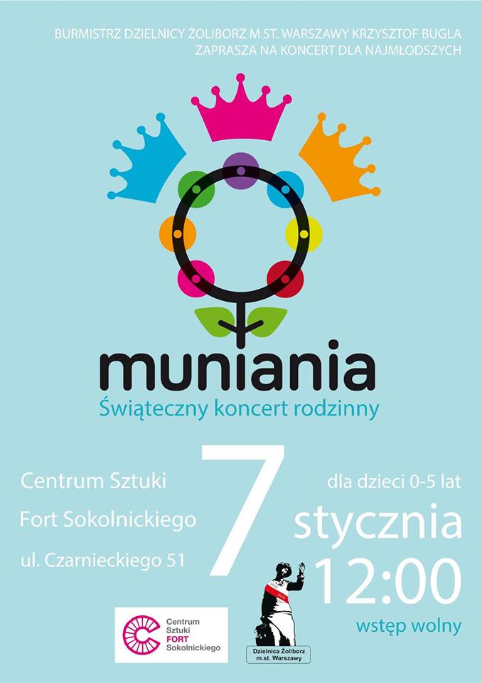 Burmistrz Dzielnicy Żoliborz m.st. Warszawy Krzysztof Bugla zaprasza na koncert dla najmłodszych Muniania w dniu 7.01.2018 o godzinie 12:00 w Centrum Sztuki Fort Sokolnickiego, ul. Czarnieckiego 51. Wstęp wolny