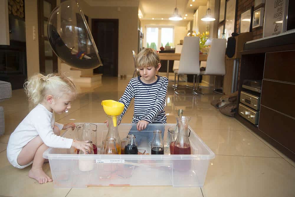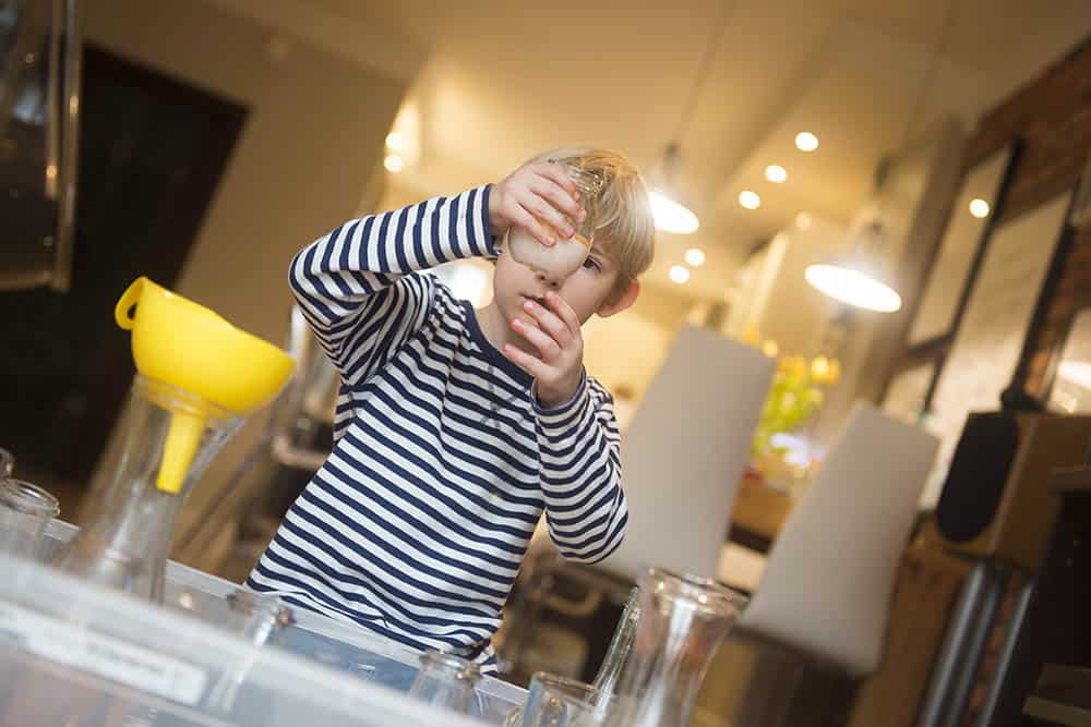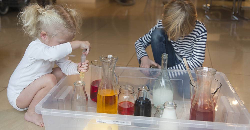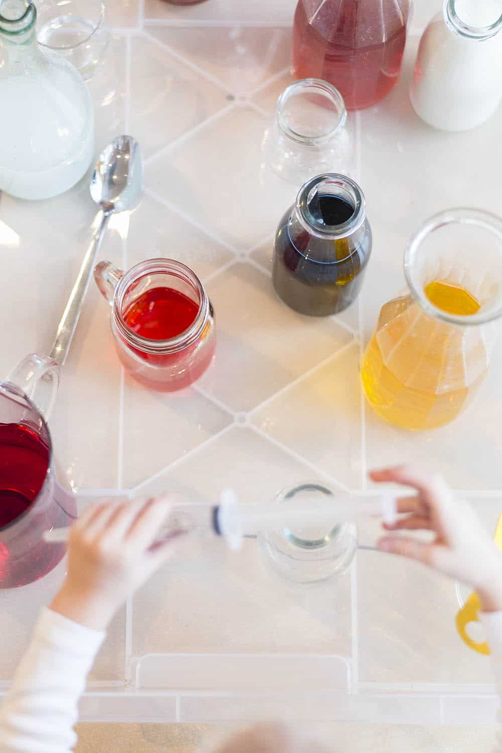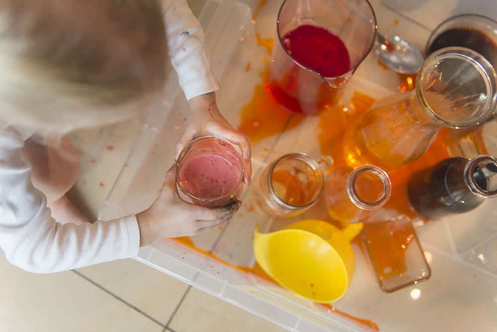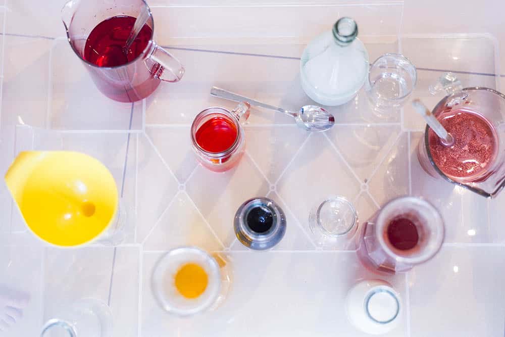 Pojemnik jest, miejsce wybrane, to teraz zbierz jak najbardziej różnorodne naczynia i naczynka, jakie tylko masz w domu. Może być tak naprawdę cokolwiek – ważne, aby były szerokie i wąskie, wysokie i niskie, duże i małe. Mogą być szklanki, puste słoiki, wazony, strzykawki, miseczki. Do tego trochę “narzędzi” – łyżki, łyżeczki, mieszadełka, lejki, strzykawki – im bardziej różnorodnie tym lepiej i tym lepsza zabawa.
