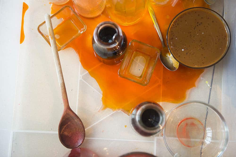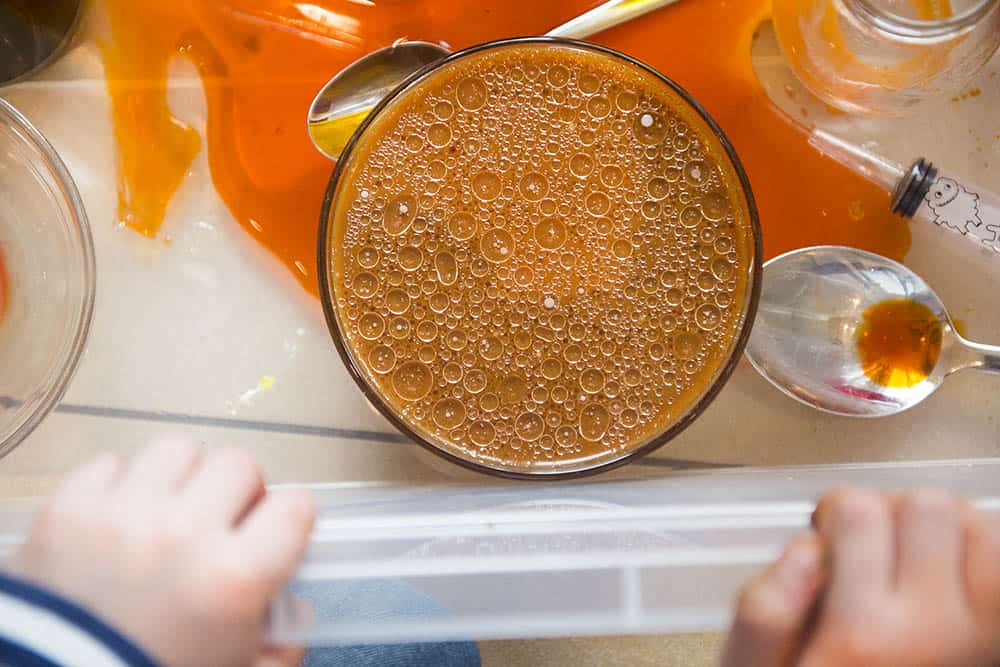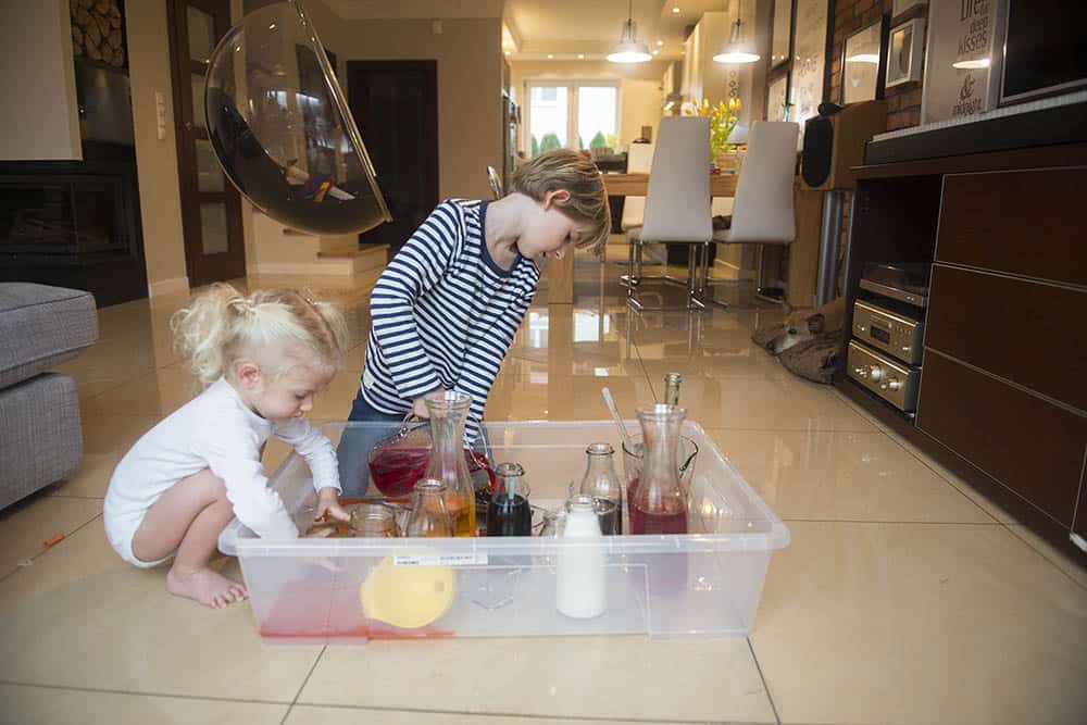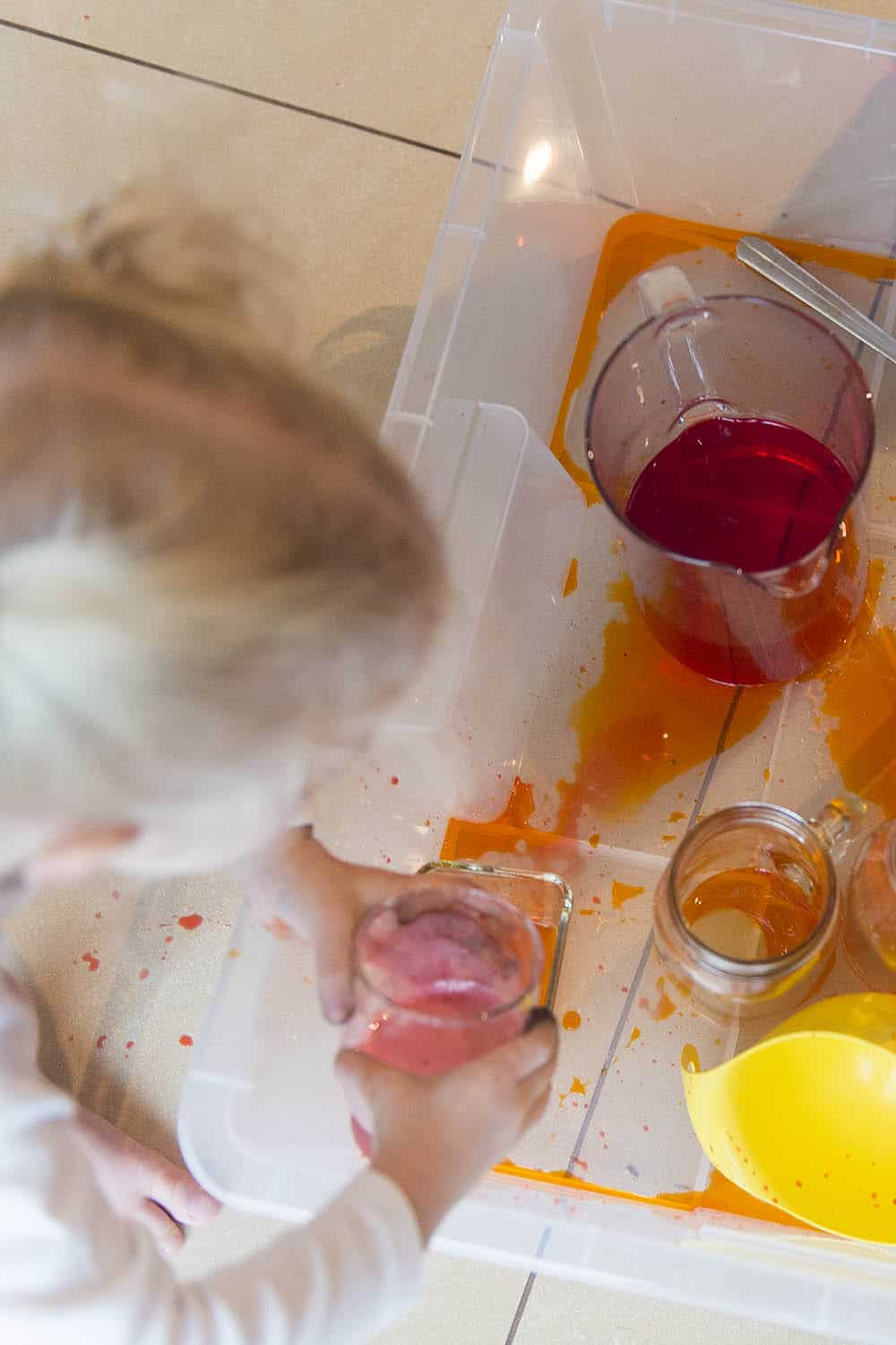 Super sprawdza się taki szeroki i płytki, najlepiej bezbarwny pojemnik, w którym odbędzie się cała akcja (lub jej większość). Jeśli nie macie pojemnika – sprawdzi się też większa miska. Ostatecznie możecie spróbować w wannie lub pod prysznicem. Ja lubię wykorzystywać te pojemniki z Ikei do wszelkich domowych działań kreatywnych (a przez resztę czasu przechowuję w nich różne rzeczy). Wydaje mi się, że podobne można kupić w marketach budowlanych i będzie to inwestycja maks. kilkunastu złotych.