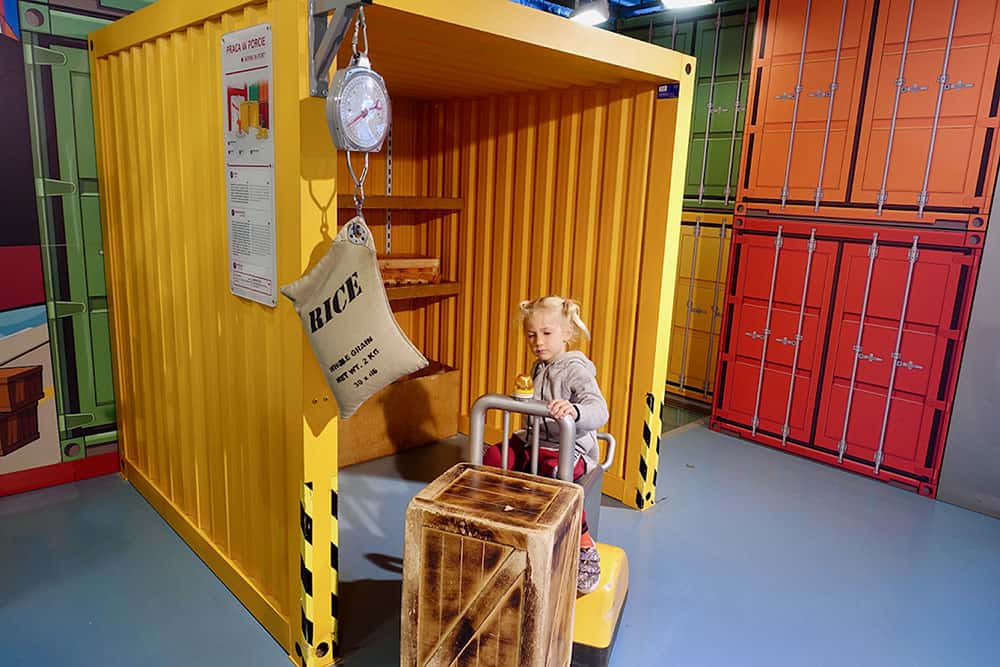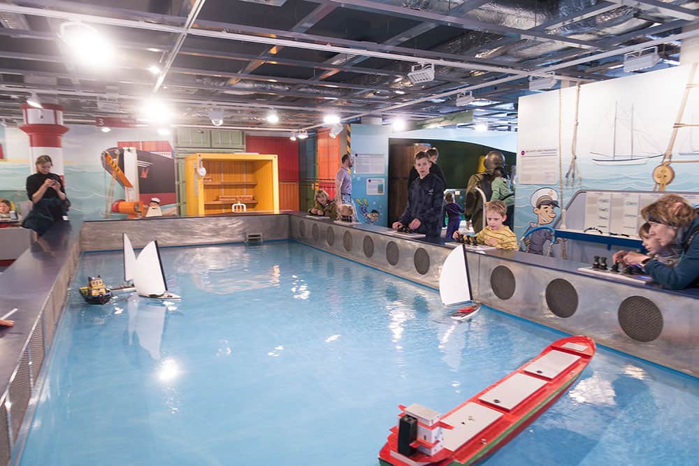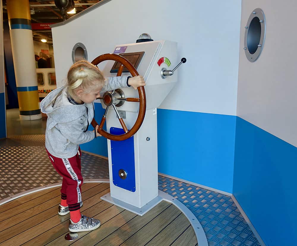 Wspaniała zabawa nie tylko dla dzieci – wystarczy spojrzeć na błyszczące oczy tatusiów sterujących żaglówkami w wielkim basenie ;). Oprócz tego na wystawie można przekonać się, jak pracuje portowy dźwig, sterować prawdziwym sterem, a nawet załadować kontenerowiec. Bilety (w cenie 6 i 10 zł) sprzedawane są na pełne godziny, zwiedzanie i zabawa w sali trwają 60 minut.