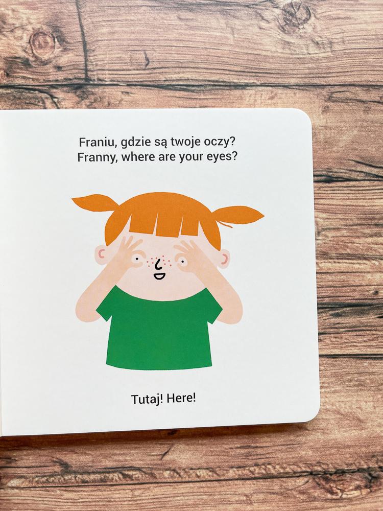 Tu dziecko uczy się zadawać pytanie “Gdzie jest..? / “Where is…?” i udziela na nie odpowiedzi. Dzięki książce poznajemy części ciała w obu językach – dziecko na pewno chętnie będzie również pokazywało, gdzie samo ma oczko, a gdzie pępek. To naturalny, najlepszy sposób nauki języka.