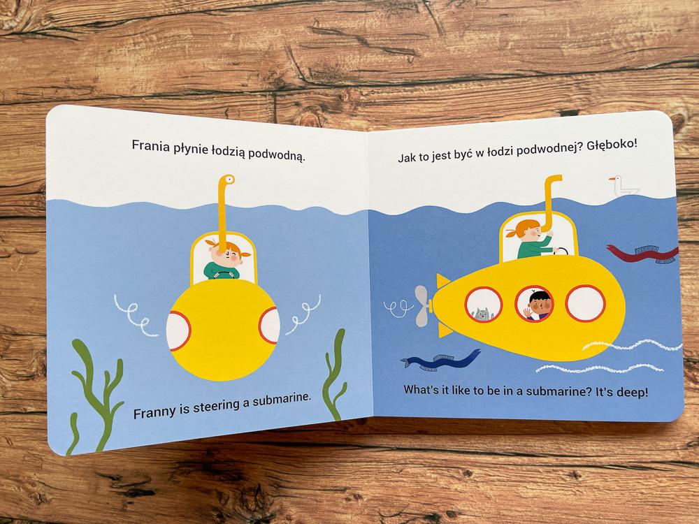Zapnijcie pasy, bo ruszamy na przejażdżkę. Będziemy podróżować pociągiem, autobusem, łodzią podwodną, koparką i… ale przecież nie mogę wszystkiego zdradzić. Na pewno dużo będzie się działo, a podróż będzie ciekawa. Polsko-angielskie książki dla dzieci to świetny sposób na osłuchanie dziecka z językiem.