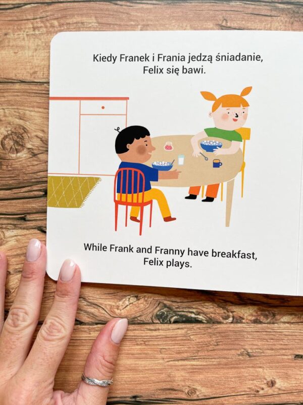 Franek i Frania to bohaterowie serii kartonowych książeczek dla dzieci. Przyjemność ze śledzenia ich przygód będą czerpali już dwuletni czytelnicy. Górnej granicy w zasadzie nie ma, Mila ma 6 lat i chętnie je ze mną ogląda. Książki przyciągają uwagę ciekawymi ilustracjami i prostymi podpisami na każdej stronie. Podpisy są zarówno w języku polskim – na górze strony, jak i po angielsku – na dole. Dzięki temu podczas czytania w naturalny sposób wprowadzamy drugi język, dając dziecku okazję na osłuchanie się z nim. Szybko okazuje się jednak, że maluch zaczyna powtarzać – pojedyncze zwroty i frazy. By nie wiedzieć kiedy krzyknąć podczas spaceru “DOG!” na widok psa sąsiada. Wiem, co mówię! :)