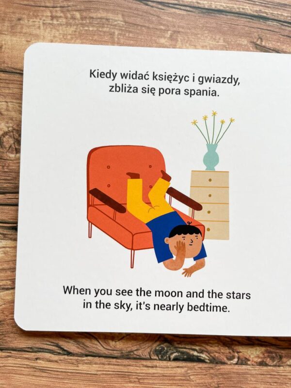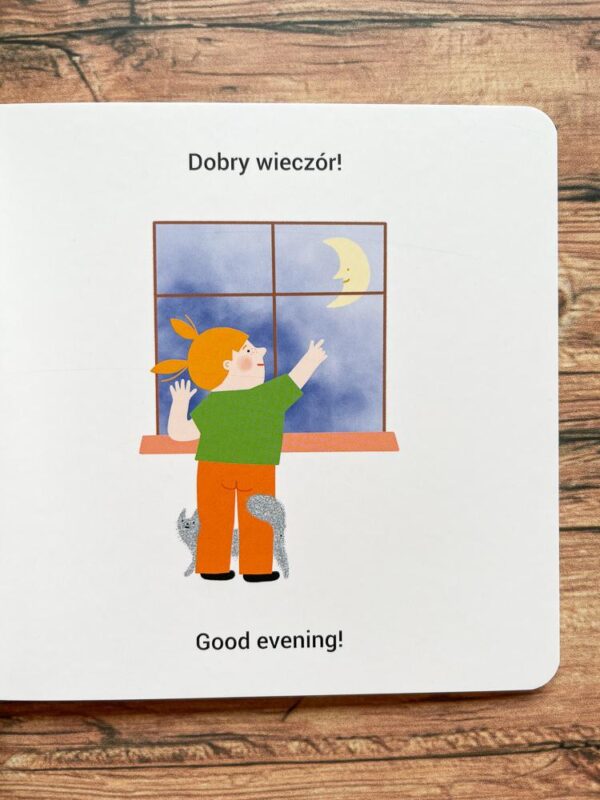 Książeczka prowadzi młodego czytelnika przez cały dzień – od pobudki, kiedy słońce wstaje, po zasypianie, gdy zapada noc. Poznajemy tu nazwy codziennych czynności, a także zwroty powitania i pożegnania – w zależności od pory dnia.