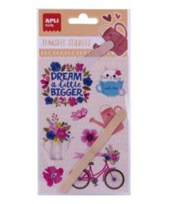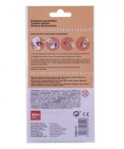 Zestaw transferowych naklejek Apli Kids z motywem kwiatów. Na specjalnej folii znajduje się aż 10 naklejek, które można odcisnąć na różnych powierzchniach za pomocą dołączonego patyczka. Doskonale sprawdzą się do ozdobienia kubka, ramki na zdjęcia, zeszytu czy szafki. Mogą być użyte na gładkich i płaskich powierzchniach typu drewno, metal, płótno, szkło, ceramika, tkanina. Wystarczy przyłożyć naklejkę do wybranego przedmiotu i potrzeć ją od zewnątrz drewnianym patyczkiem.
