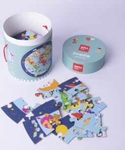 Puzzle w tubie Apli Kids spodobają się każdemu małemu odkrywcy. Układanka składa się z 48 elementów, które po ułożeniu przedstawiają okrągłą mapę świata. Dzieci podczas zabawy odkryją kontynenty, oceany oraz zwierzęta występujące na naszej planecie. Do zestawu w celu ułatwienia układania puzzli dołączony jest rzeczywistych rozmiarów plakat z obrazkiem. Kolorowa, wesoła grafika zachęci do zabawy. Puzzle zapakowane w trwałe, kartonowe pudełko z rączką ułatwiającą przenoszenie, idealnie sprawdzą się na prezent.