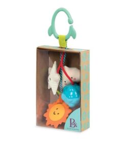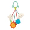 Całość na obręczy w kształcie rakiety, która pełni funkcję gryzaka zapewniającego ulgę podczas ząbkowania, a równocześnie pozwala przywiesić zabawkę w dowolnym miejscu.
