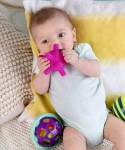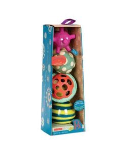 – piłka z otworami i grzechotką w środku – idealna dla małych rączek uczących się chwytać.