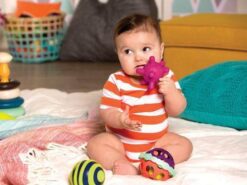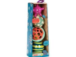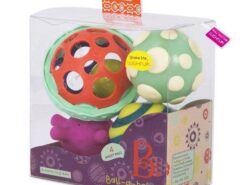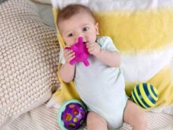– piłka z otworami i grzechotką w środku – idealna dla małych rączek uczących się chwytać.