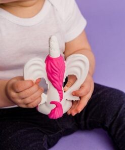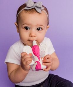 Szczoteczka treningowa została specjalnie zaprojektowana dla dzieci od 3 do 24 miesięcy. Wykonana z bezpiecznego i elastycznego silikonu, delikatnie ukoi bolesne ząbkowanie masując dziąsła malucha, jednocześnie rozwijając nawyki higieniczne. Miękki silikon zmniejsza ryzyko zranień. Szczoteczka posiada uchwyty w kształcie skrzydełek, które są łatwe do utrzymania przez małe rączki dziecka, jednocześnie zapobiegając zadławieniu się. Ta urocza szczotka nie tylko rozwija dobre nawyki pielęgnacji jamy ustnej, ale także oferuje fascynującą różnorodność kształtów i tekstur do odkrycia. Dzięki otworom w skrzydełkach szczoteczkę można przyczepić do zawieszki i mieć ją zawsze przy sobie. Kształt jednorożca umożliwia postawienie go w pozycji pionowej, dzięki czemu szczoteczka nie będzie stykała się z podłożem. To magiczne stworzenie stanie się najlepszym kumplem dziecka!