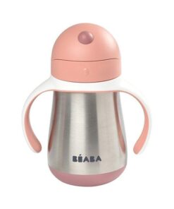 Pojemna, poręczna i lekka butelka ze słomką francuskiej marki BEABA wykonana została ze stali nierdzewnej, odpornej na korozję, zarysowania, wgniecenia i zanieczyszczenia. Ma podwójną ściankę, dzięki czemu dłużej utrzymuje pożądaną temperaturę napoju (zarówno zimną, jak i ciepłą). Ergonomiczny kształt, wygodny dla dziecięcych rączek oraz dodatkowy zdejmowany uchwyt z dwoma uchami ułatwiają malcowi samodzielne trzymanie. Wymienna silikonowa słomka posiada zawór, dzięki któremu butelka pełni funkcję kubka niekapka. Słomka jest profilowana i umocowana w zakrętce, co zapewnia jej stabilną pozycję i odpowiedni przepływ powietrza podczas picia. Zamknięcie – zintegrowana klapka na klik – jest szczelne, bezpieczne i higieniczne, a przy tym łatwe do samodzielnego otwierania i zamykania przez dziecko. Butelka przeznaczona jest dla dzieci od 8. miesiąca życia i pomaga w nauce samodzielnego picia. Słomkę można wyjmować do mycia, a w razie potrzeby – wymienić na nową.