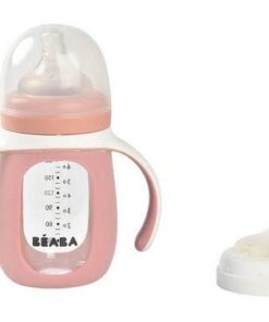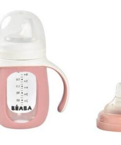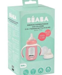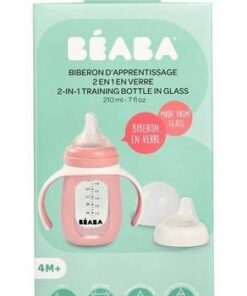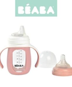 Pojemna, poręczna i lekka szklana butelka treningowa 2w1 francuskiej marki BEABA w specjalnej silikonowej osłonce z dwoma uchwytami, która nie tylko chroni ją przed stłuczeniem, ale także ułatwia dziecku przejście z karmienia na samodzielne picie. Osłonkę można zdejmować, np. do mycia. W komplecie znajduje się ponadto silikonowy smoczek-niekapek (płyn wydostaje się z niego wyłącznie podczas ssania) do używania już od 4. miesiąca życia, oraz ustnik-niekapek dla starszych dzieci. Każda z końcówek ma własną nakrętkę dla wygodnego i bardziej higienicznego wymieniania. W zestawie jest również bezpieczne i szczelne transparentne wieczko. Na ściance butelki znajduje się skala pojemności (do 210 ml), dzięki której można podać maluchowi odpowiednią ilość płynu lub sprawdzić, ile dziecko wypiło. To idealna butelka do nauki samodzielnego picia.