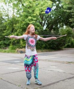 Sprawdź czy potrafisz wykonać różne sztuczki i podrzucić do góry bądź zrobić pętle, tak aby diabolo było cały czas w ruchu. Diabolo wykonano z gumy o średnicy 10 cm, drewniane kijki o długości 38 cm, lina 175 cm.