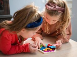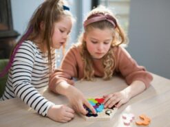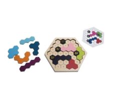 Plansza (18cm ) , złote pszczółki (4 szt) oraz elementy układanki ( 9 szt, różne kształty) wykonane są z drewna.