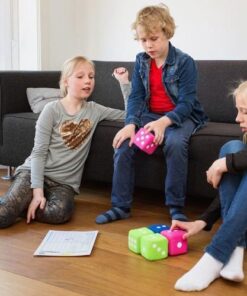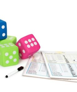 Zestaw zawiera 5 kostek o wymiarach: 8 x 8 cm, tablicę do wyników oraz 2 ścieralne markery.