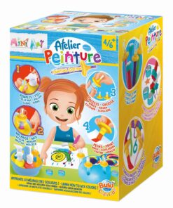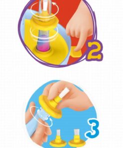 Spójrz na krążek z barwami, wlej odpowiednie kolory farb do pojemników, umieść je w mieszalniku, naciśnij przycisk i obserwuj jak pojemniki się kręcą a kolory mieszają ze sobą! Zestaw farb, przy użyciu którego dziecko uczy się mieszania barw podstawowych i otrzymywania kolorów pochodnych. Każdy krążek z barwami pokazuje ile dawek danego koloru należy użyć, aby otrzymać kolor pochodny.
