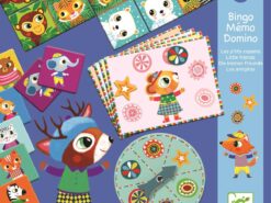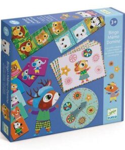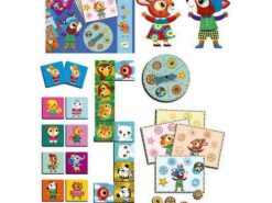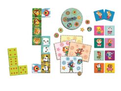 Zestaw trzech gier dla najmłodszych dzieci: domino, memo i ruletka- ze zwierzątkami. Daje dzieciom dużo radości, rozwija spostrzegawczość, i ćwiczy pamięć. Całość zapakowana w estetyczne i trwałe opakowanie. Elementy gier wykonane z grubego lakierowanego kartonu.