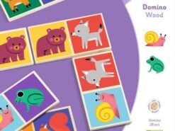 Zabawna, klasyczna gra domino z kolorowymi zwierzętami i klockami w kształcie prostokąta. Po drugiej stronie znajdują się, małe owady, które dzieci mogą liczyć i dopasowywać.