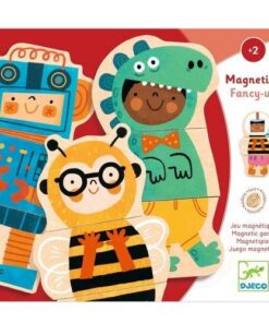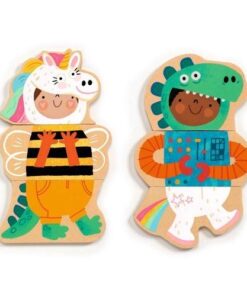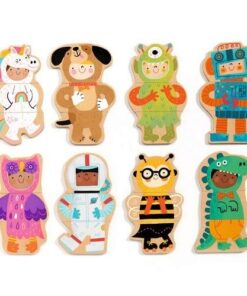 Zestaw 24 drewnianych magnesów do układania kostiumów na bal przebierańców lub tworzenia zwariowanych kombinacji. Każda z ośmiu postaci składa się z głowy, tułowia i nóg. Idealna zabawka do gry na role. Zapakowana w praktyczne pudełko, łatwe w przechowywaniu. Poszczególne elementy są wykonane z drewna posiadającego certyfikat FSC®.