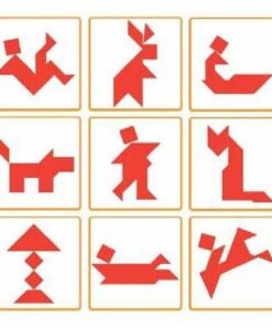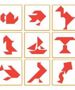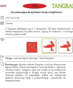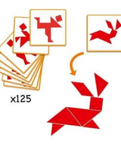 Zawartość: 1 Tangram składający się z 7 elementów, 125 kart obustronnych: na każdej znajdujemy na jednej stronie „figurę do ułożenia”, a na drugiej stronie „podpowiedź”. Cel gry: wykonać figury używając 7 form Tangram. Przebieg gry: dziecko wybiera Tangram i próbuje odwzorować figurę z karty. Obserwuje najpierw tę stronę karty z „ figurą do odwzorowania” następnie, gdy już uważa, że ją zrealizował, sprawdza podpowiedź z drugiej strony karty, czy dobrze wykonał zadanie. W przypadku, gdyby nie zrealizował zadania, obserwuje kartę z podpowiedzią i przechodzi