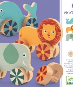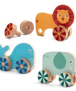 Drewniane wkrętki Zwierzątka od Djeco, to zabawna, drewniana układanka dla najmłodszych. Zabawa polega na tym, by dokręcić elementy w kształcie zwierzątek w odpowiednie miejsca. Powstaną wtedy zabawne zwierzaczki, które po wkręceniu kółeczek mogą jeździć po podłodze lub innej powierzchni.