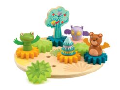 W zestawie Djeco znajdziemy 8 kolorowych kół zębatych, 3 figurki drewniane takie jak żabka, miś, sowa oraz choinkę i drzewo.