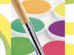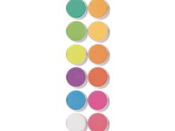 Zestaw 12 płaskich pojemniczków z farbami gwaszowymi w kolorach neonowych. Gwasze to kryjąca farba wodna (zbliżona do akwareli, jednak o właściwościach kryjących). Gwasze, oprócz kryjącego pigmentu zawierają jeszcze biały wypełniacz (np. kredę lub biel cynkową), oraz spoiwo z gum roślinnych, takie samo jak w technice akwarelowej