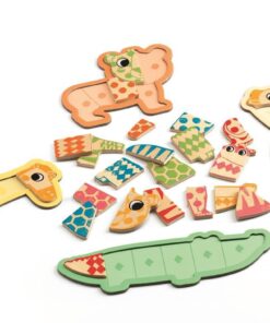 Drewniana układanka w kształcie zwierzątek: żyrafy, tygryska, zebry i krokodyla. Dziecko rzuca kostką i na podstawie jaki kolor wypadł na kostce układa elementy danego zwierzątka