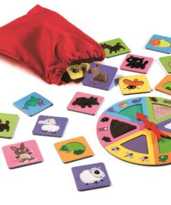 Lotto dotykowe to gra edukacyjna Djeco dla najmłodszych. Dzieci kręcą wskazówką na planszy, a następnie dotykają futerka zwierzaka na jakim zatrzymała się wskazówka. Następnie odnajdują zwierzaka, wkładając rękę do woreczka i rozpoznając go po futerku. Gra składa się z 18 elementów wielkości 6 x 6cm