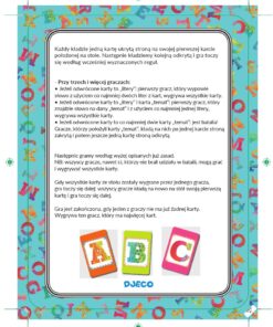 Gra doskonale rozwija spostrzegawczość oraz refleks dziecka. Dodatkowo doskonale sprawdzi się podczas nauki alfabetu. Piękne ilustracje, które zdobią karty dodatkowo uatrakcyjniają całą zabawę.