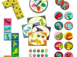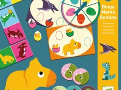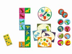 Zestaw trzech gier dla najmłodszych dzieci: domino, memo i ruletka- z dinozaurami. Daje dzieciom dużo radości, rozwija spostrzegawczość, i ćwiczy pamięć. Całość zapakowana w estetyczne i trwałe opakowanie. Elementy gier wykonane z grubego lakierowanego kartonu.