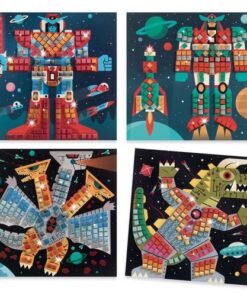 Na podstawie podanych numerów widocznych na ilustracji dziecko przykleja samoprzylepne piankowe, kolorowe błyszczące kwadraty, tworząc obrazy gdzie roboty mierza sie z potworami.