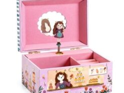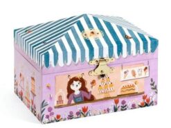 Drewniana szkatułka z pozytywką – pięknie zaprojektowane muzyczne pudełko na biżuterię CUKIERNIA. . Wewnątrz szkatułki znajduje się lusterko i figurka , która obraca się w takt grającej melodii. Pozytywka uruchamia się po otwarciu szkatułki i nakręceniu mechanizmu. Śliczna ozdoba do dziecięcego pokoju. Melodia pozytywki: ” Antoine’a Renarda „Le Temps des cerises”