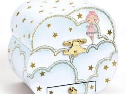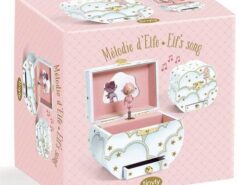 Pięknie zaprojektowana drewniana szkatułka z pozytywką w kształcie chmurki. Wewnątrz znajduje się figurka obracającego się ELFA oraz lusterko. Pozytywka uruchamia się po otwarciu i nakręceniu mechanizmu, a grająca melodia to “Zaproszenie do Walca” Carla Marii von Webera. Szkatułka to idealna ozdoba dziecięcego pokoju oraz praktyczne miejsce na biżuterię.