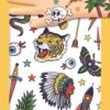 Dwa arkusze pełne kolorowych tatuaży. Wytnij wybrany tatuaż, delikatnie odklej ochronną folię, przyłóż tatuaż do skóry i lekko zwilż papierek. Przyciśnij mocno papierek przez 30 sekund, potem delikatnie usuń, a tatuaż pozostanie na skórze.