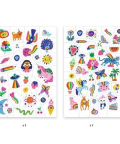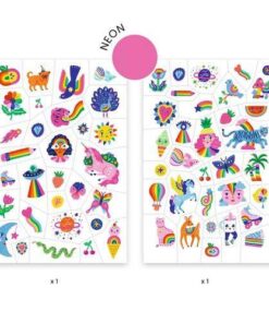 Dwa arkusze pełne kolorowych tatuaży. Wytnij wybrany tatuaż, delikatnie odklej ochronną folię, przyłóż tatuaż do skóry i lekko zwilż papierek. Przyciśnij mocno papierek przez 30 sekund, potem delikatnie usuń, a tatuaż pozostanie na skórze.