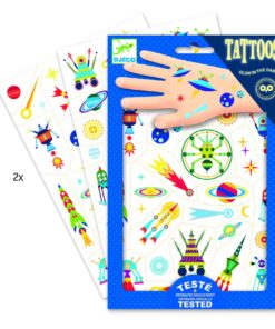 Dwa arkusze pełne kolorowych tatuaży. Wytnij wybrany tatuaż, delikatnie odklej ochronną folię, przyłóż tatuaż do skóry i lekko zwilż papierek. Przyciśnij mocno papierek przez 30 sekund, potem delikatnie usuń, a tatuaż pozostanie na skórze.