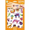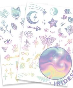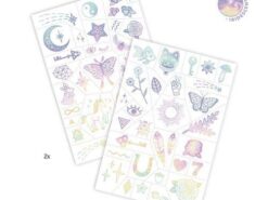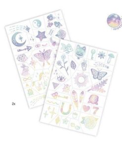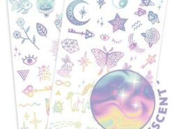 Dwa arkusze pełne kolorowych tatuaży. Wytnij wybrany tatuaż, delikatnie odklej ochronną folię, przyłóż tatuaż do skóry i lekko zwilż papierek. Przyciśnij mocno papierek przez 30 sekund, potem delikatnie usuń, a tatuaż pozostanie na skórze.