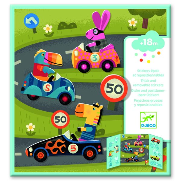 Zestaw artystyczny „AUTA” to książeczka z naklejkami wielokrotnego użytku. Zestaw jest w kształcie książeczki ( ma podwójne strony o szerokości 43 cm po rozłożeniu) z grafiką toru wyścigowego i 11 naklejkami w komplecie. Dzieci będą mogły ozdabiać ilustracje i komponować niezliczone sceny wyścigów samochodowych. Naklejki łatwe do swobodnego załapania, naklejania i odklejania.