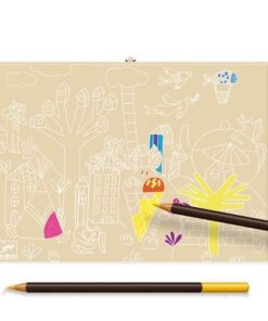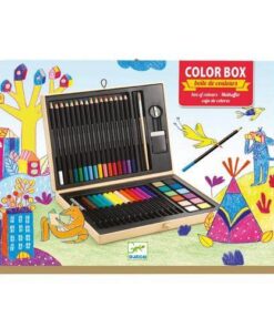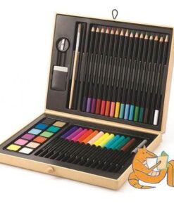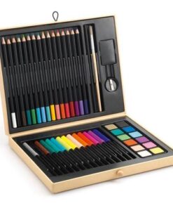 Zestaw artystyczny, w skład którego wchodzą farby akwarelowe, kredki, mazaki, gumka i pędzelek.