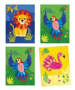 Kreatywny zestaw dla dzieci, w którym można stworzyć 4 duże obrazy ze zwierzętami. Składając i przyklejając kolorowe paski papieru, dziecko stworzy piękną lwią grzywę, piękną papugę, upierzenie flamingów oraz wspaniały płaszcz dla lamy.