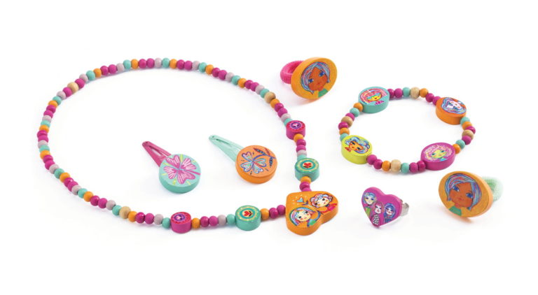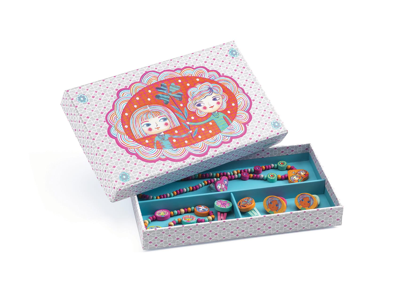 Zestaw drewnianej biżuterii. Każda z części biżuterii jest zapakowana w oddzielna bibułkę i leży w oddzielnej przegródce. W skład zestawu wchodzi: naszyjnik, bransoletka, pierścionek, po 2 gumki i spinki.