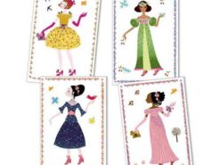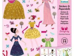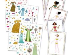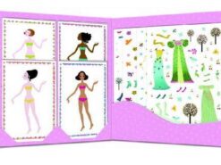 Gotowe karty z postaciami do ubrania za pomocą naklejek. Do wielokrotnego użycia. Zestaw zawiera: – 8 kartek z laleczkami-modelkami – 4 karty z naklejkami strojów i akcesoriów.