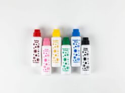 Flamastry Kropkowe stworzone przez Do-A-Dot Art to zmywalna farba w płynie w dużej, dopasowanej do rączek dziecka butelce, zakończonej dużą, miękką gąbeczką, która nie wysycha i zawsze pozostawia na kartce idealną kropkę. Butelka zawiera nietoksyczną, zmywalną farbę, szybko wysychającą, w żywych kolorach, która nie rozlewa się, ani nie rozpryskuje.