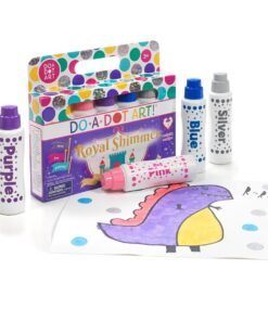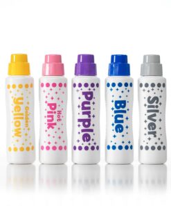 Flamastry Kropkowe stworzone przez Do-A-Dot Art to zmywalna farba w płynie w dużej, dopasowanej do rączek dziecka butelce, zakończonej dużą, miękką gąbeczką, która nie wysycha i zawsze pozostawia na kartce idealną kropkę. Butelka zawiera nietoksyczną, zmywalną farbę, szybko wysychającą, w żywych kolorach, która nie rozlewa się, ani nie rozpryskuje. Zestaw flamastrów, w całości wyprodukowanych w USA, zawiera 5 markerów w pięknych, błyszczących kolorach – różowy, fioletowy, niebieski, żółty, srebrny.