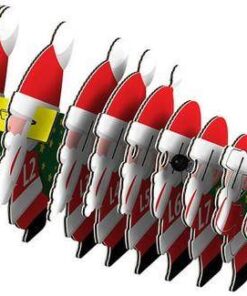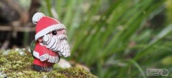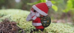 Święty Mikołaj Eugy ma dużą torbę z prezentami. Na torbie są złote gwiazdki aby bardziej przybliżał świąteczny nastrój. Mikołaj ma klasyczną, dużą białą brodę. Ręka Świętego Mikołaja jest w górze, ponieważ Mikołaj do Ciebie macha.