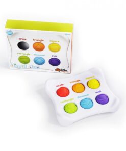 Każdy silikonowy bąbelek z jednej strony ma wytłoczony kształt i oznaczony pasującym słowem w języku angielskim i alfabecie Braille’a, z drugiej strony bąbelki są gładkie, a słowa opisują kolory silikonowych przycisków!