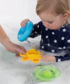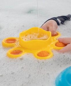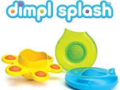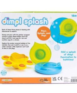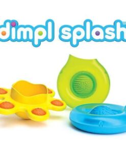 Nabieraj i polewaj wodę okrągłym dzbankiem z Dimpl pośrodku. Nalej wody do małej oponki z Dimpl w centrum, przechyl ją w jedną stronę aby padał deszcz, w drugą aby płynął strumień. Odkryj bąbelki Dimpl żółtej rozgwiazdy, która może być kubeczkiem lub dryfującą łódeczką na wodzie.