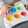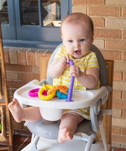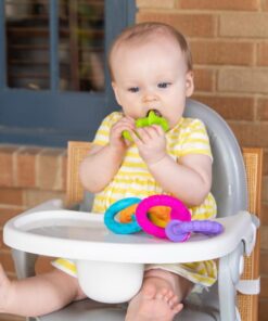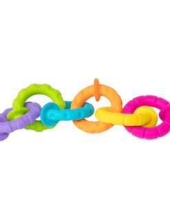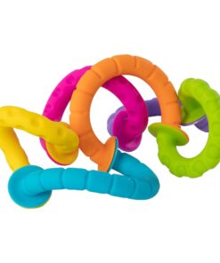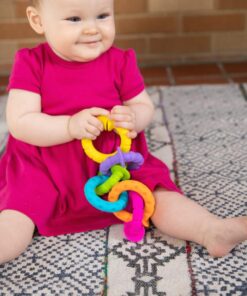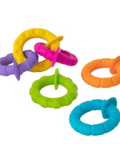Sześć silikonowych pierścieni, każdy w innym kolorze, o różnej fakturze powierzchni, zakończonych łączącymi je przyssawkami. Zabawka, która od pierwszego dotknięcia da radość zmysłom dziecka i zapewni godziny odkrywczej zabawy.