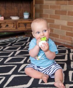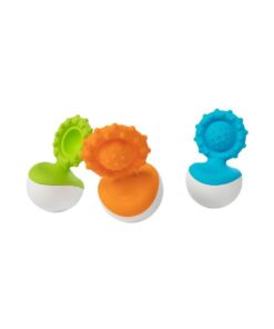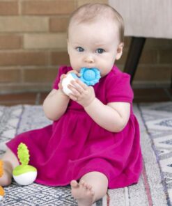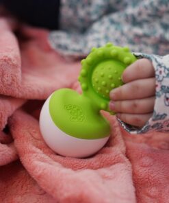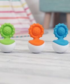 Z jednej strony niebieski, silikonowy bąbelek, który małe palce będą wypychać, w silikonowej oprawce, całej w małe wypustki pobudzające zmysł dotyku; z drugiej strony okrągła wańka-wstańka, do kołysania i kręcenia, dzięki, której silikonowa część gryzaka nigdy nie będzie leżeć na podłodze. Kołyszący się Dimpl Gryzak będzie fascynować dzieci ruchem, wyglądem i fakturą powierzani. Prawdziwa radość dla zmysłów dziecka.